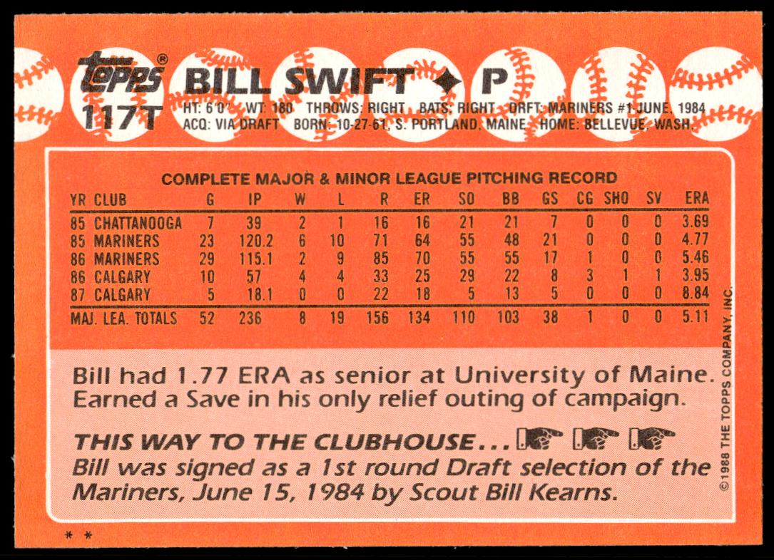 This Baseball card, from 1988 is part of the Topps Traded card set. Bill Swift is featured and has a card number of 117T.