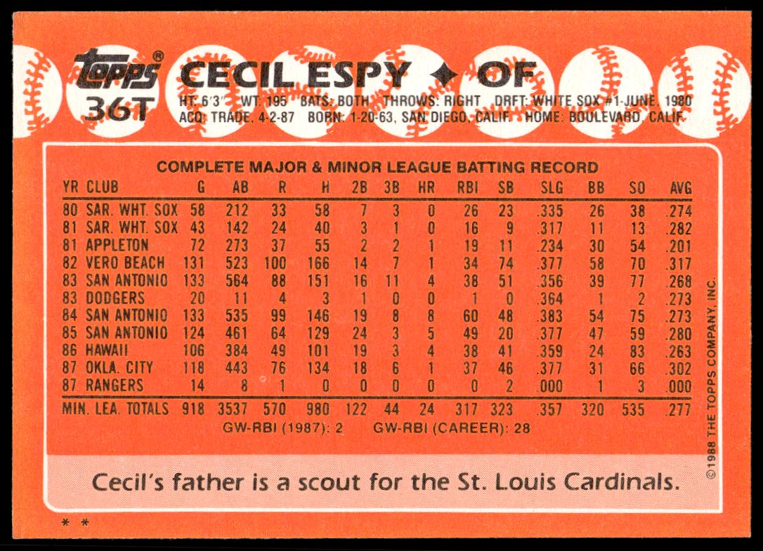 This Baseball card, from 1988 is part of the Topps Traded card set. Cecil Espy is featured and has a card number of 36T.