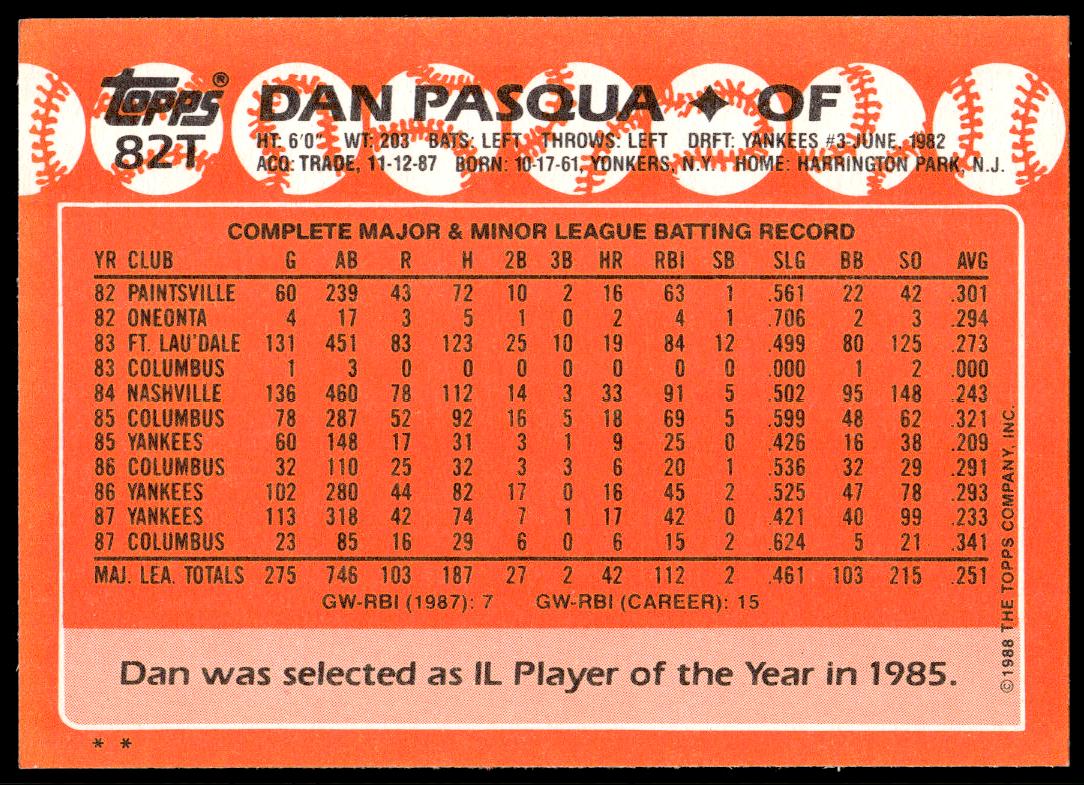 This Baseball card, from 1988 is part of the Topps Traded card set. Dan Pasqua is featured and has a card number of 82T.