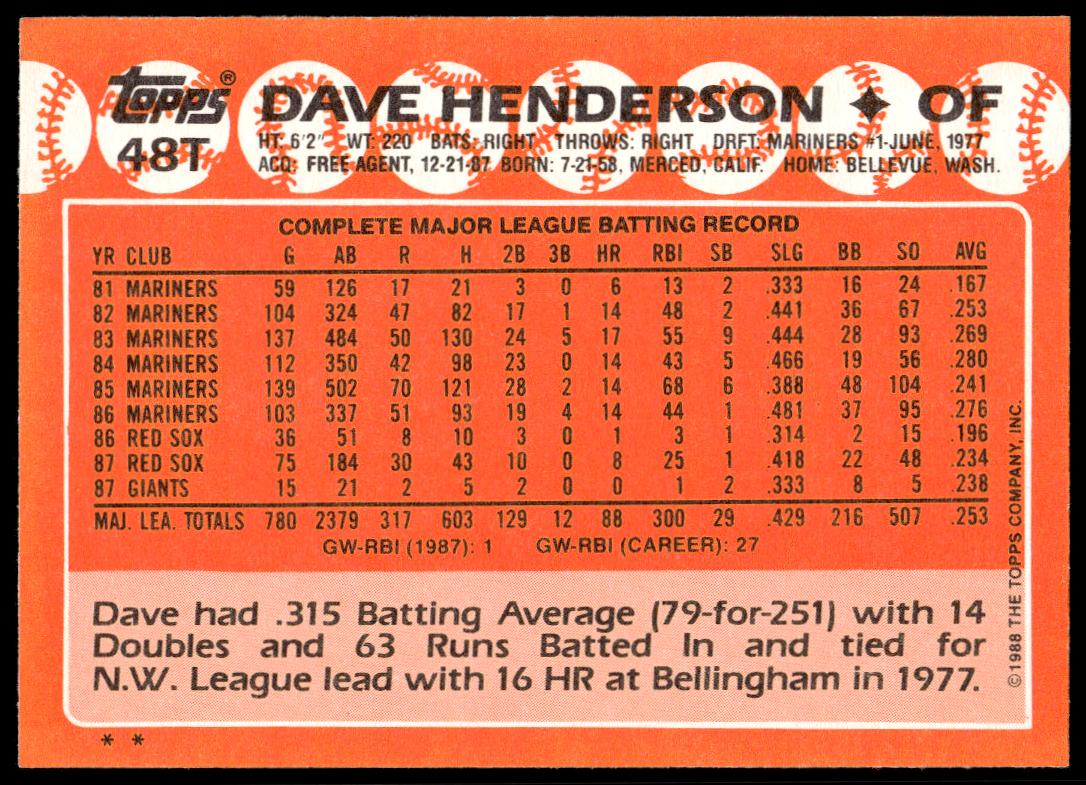 This BaseballΒ card, from 1988 is part of the Topps TradedΒ card set. Dave Henderson is featured and has a card number of 48T.