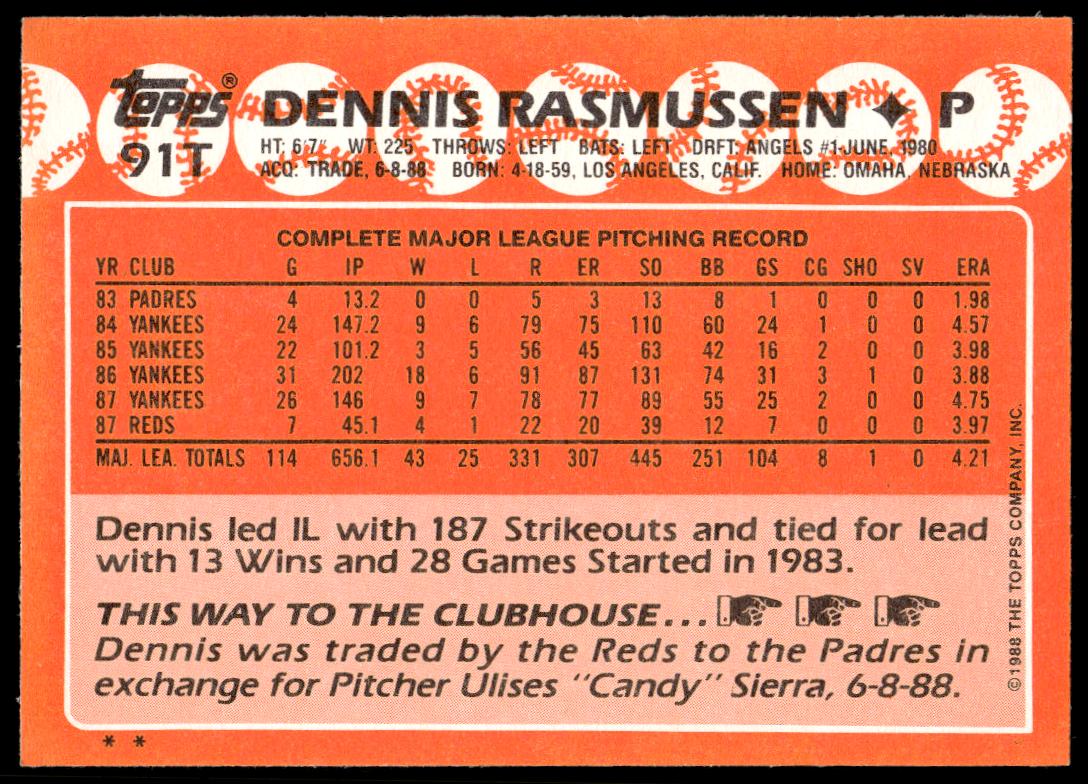 This BaseballΒ card, from 1988 is part of the Topps TradedΒ card set. Dennis Rasmussen is featured and has a card number of 91T.