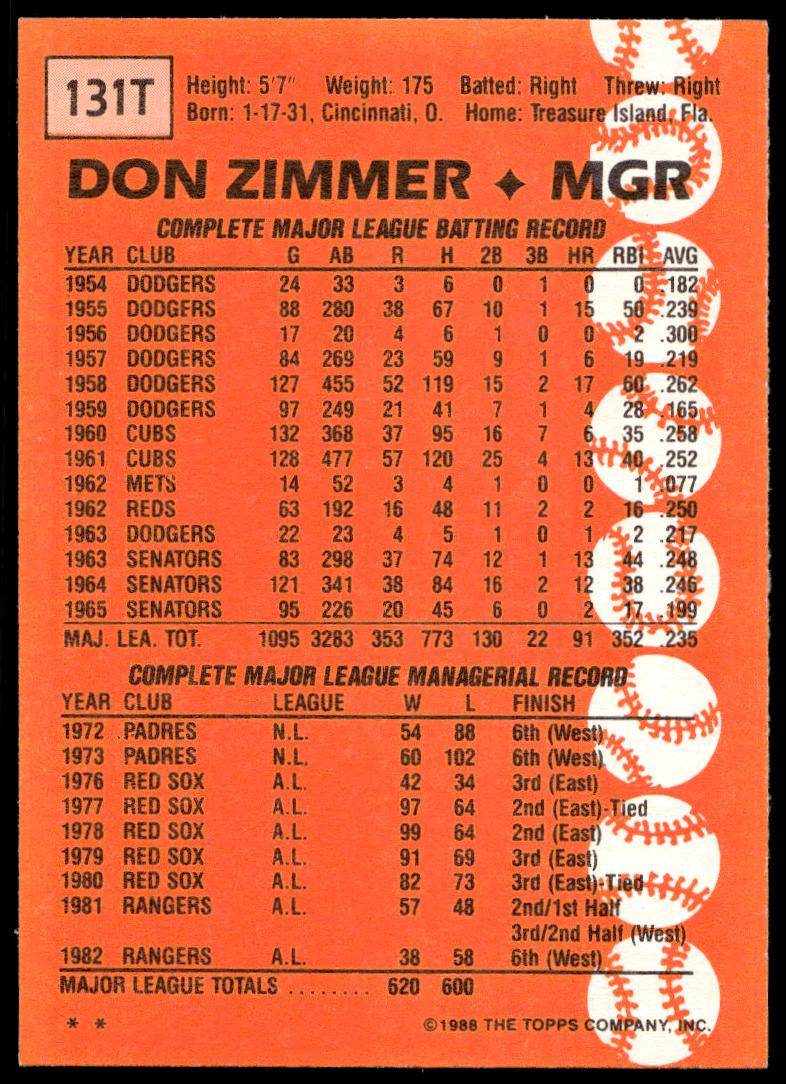This BaseballΒ card, from 1988 is part of the Topps TradedΒ card set. Don Zimmer is featured and has a card number of 131T.