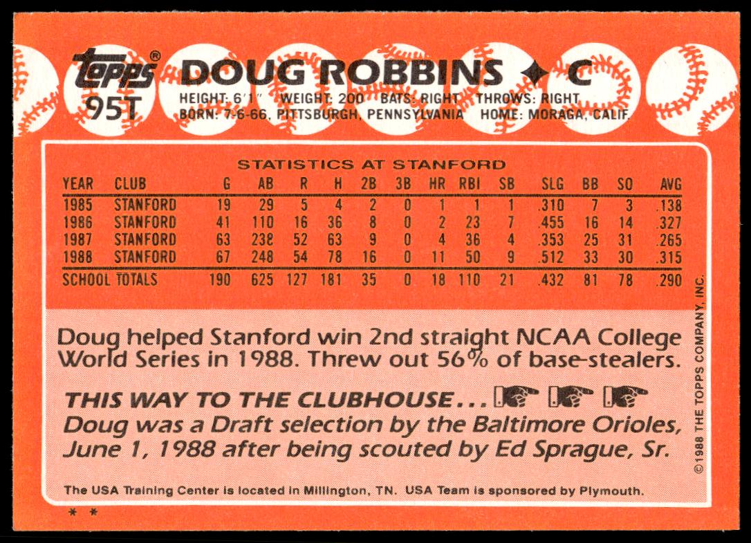 This BaseballΒ card, from 1988 is part of the Topps TradedΒ card set. Doug Robbins is featured and has a card number of 95T.