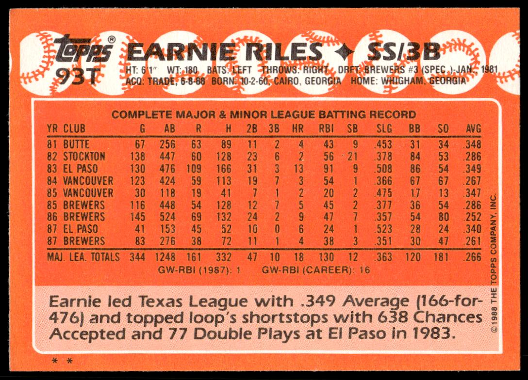This BaseballΒ card, from 1988 is part of the Topps TradedΒ card set. Earnie Riles is featured and has a card number of 93T.