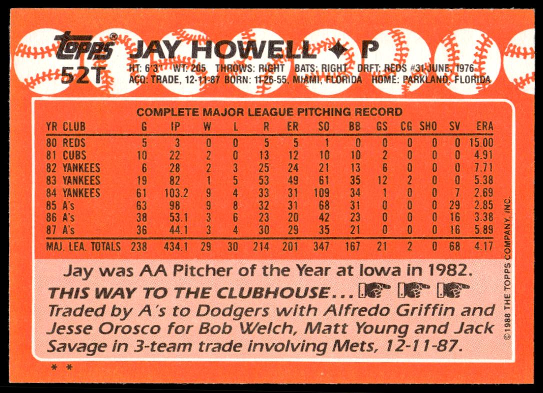 This Baseball card, from 1988 is part of the Topps Traded card set. Jay Howell is featured and has a card number of 52T.