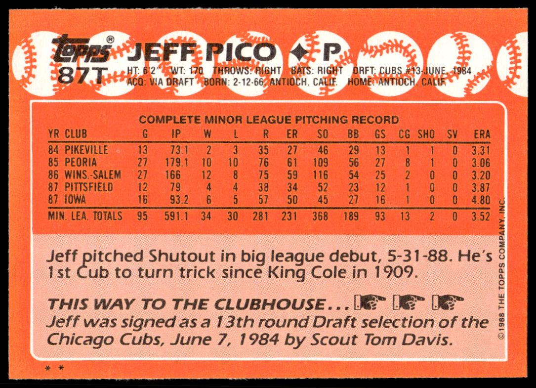 This Baseball card, from 1988 is part of the Topps Traded card set. Jeff Pico is featured and has a card number of 87T.
