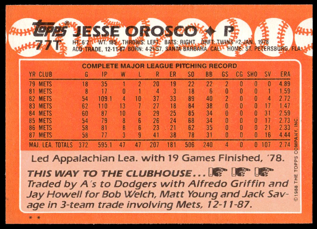 This BaseballΒ card, from 1988 is part of the Topps TradedΒ card set. Jesse Orosco is featured and has a card number of 77T.