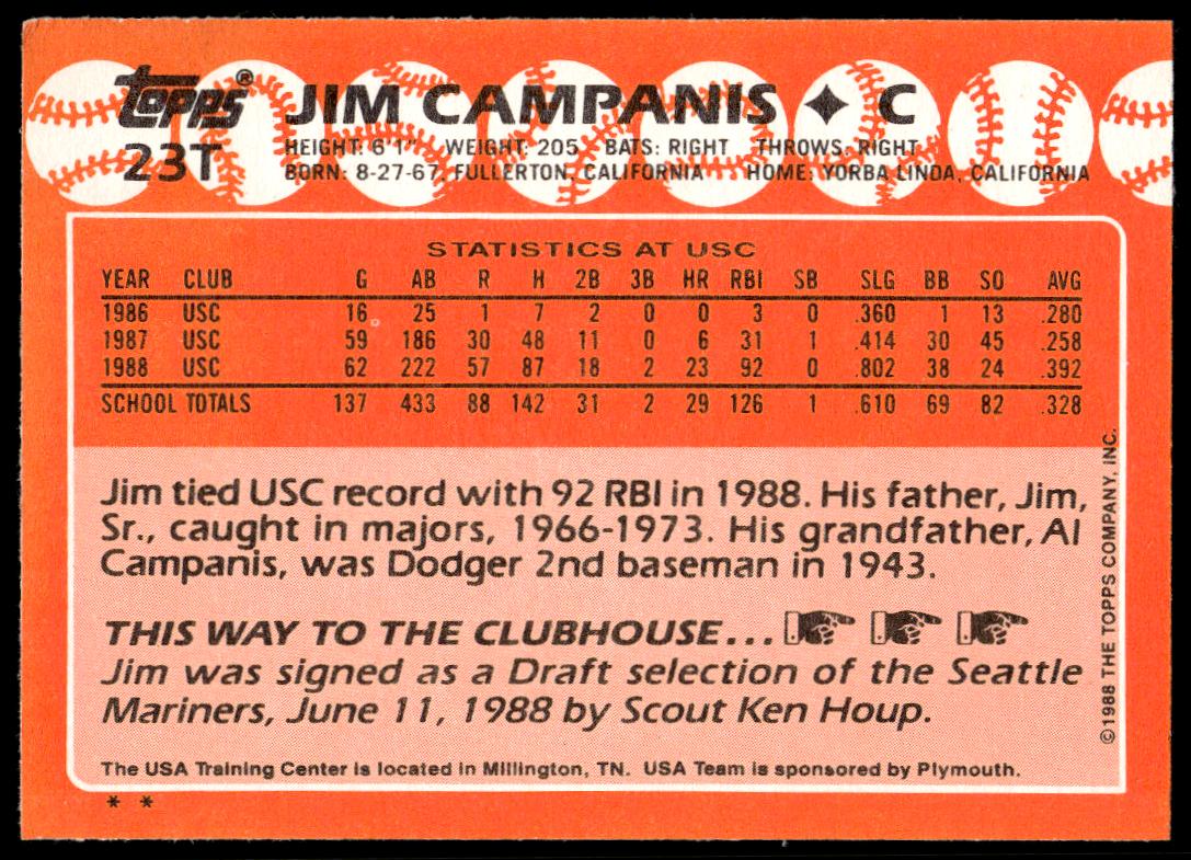 This BaseballΒ card, from 1988 is part of the Topps TradedΒ card set. Jim Campanis is featured and has a card number of 23T.