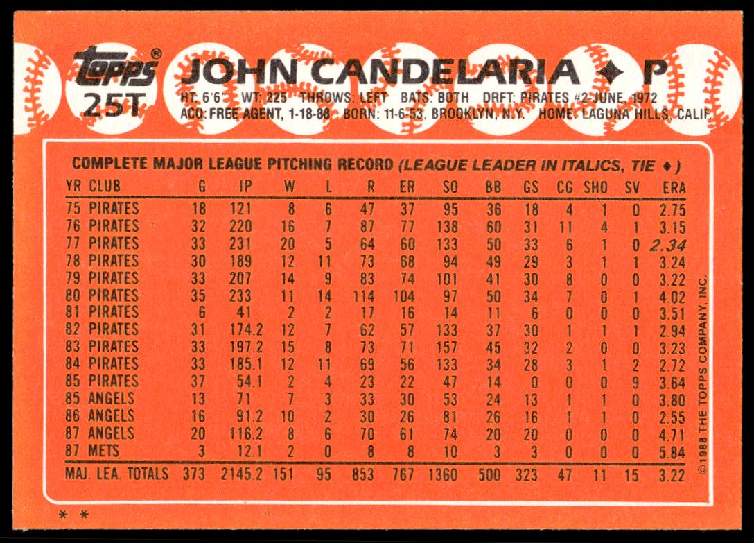 This BaseballΒ card, from 1988 is part of the Topps TradedΒ card set. John Candelaria is featured and has a card number of 25T.