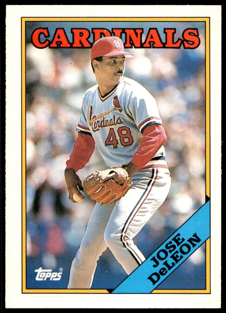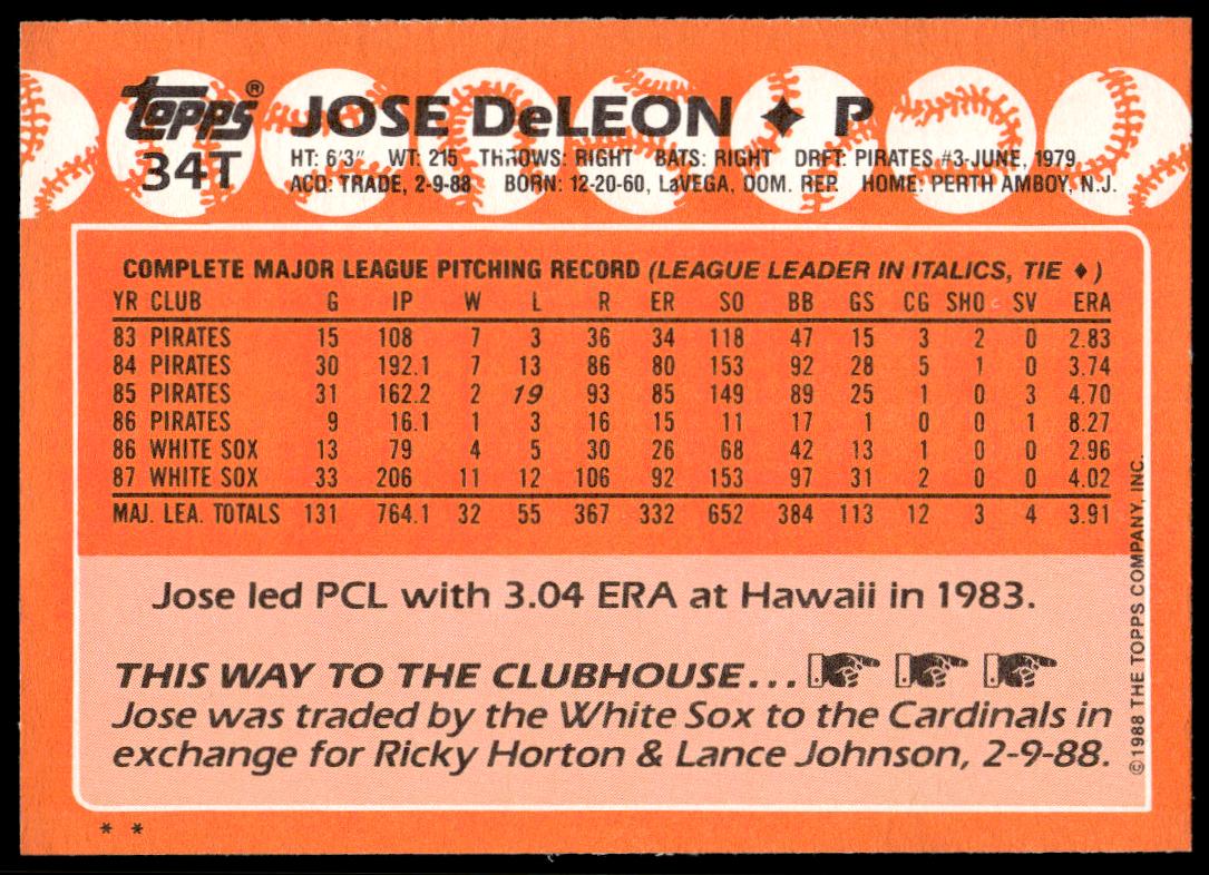 This BaseballΒ card, from 1988 is part of the Topps TradedΒ card set. Jose DeLeon is featured and has a card number of 34T.