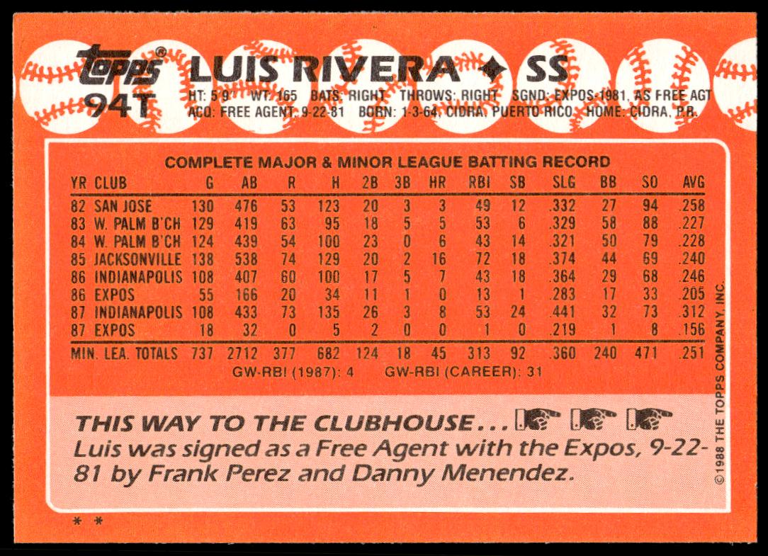This BaseballΒ card, from 1988 is part of the Topps TradedΒ card set. Luis Rivera is featured and has a card number of 94T.