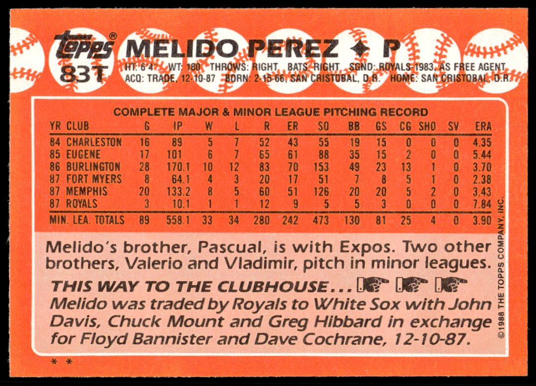 This BaseballΒ card, from 1988 is part of the Topps TradedΒ card set. Melido Perez is featured and has a card number of 83T.