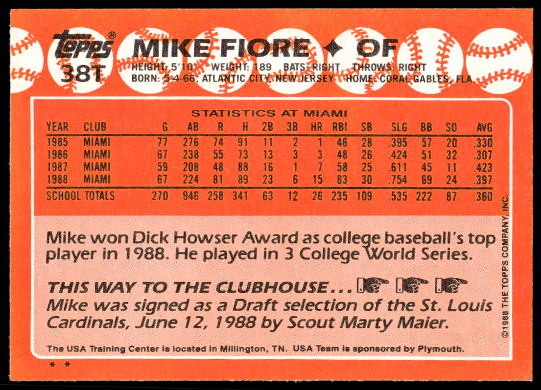 This Baseball card, from 1988 is part of the Topps Traded card set. Mike Fiore is featured and has a card number of 38T.