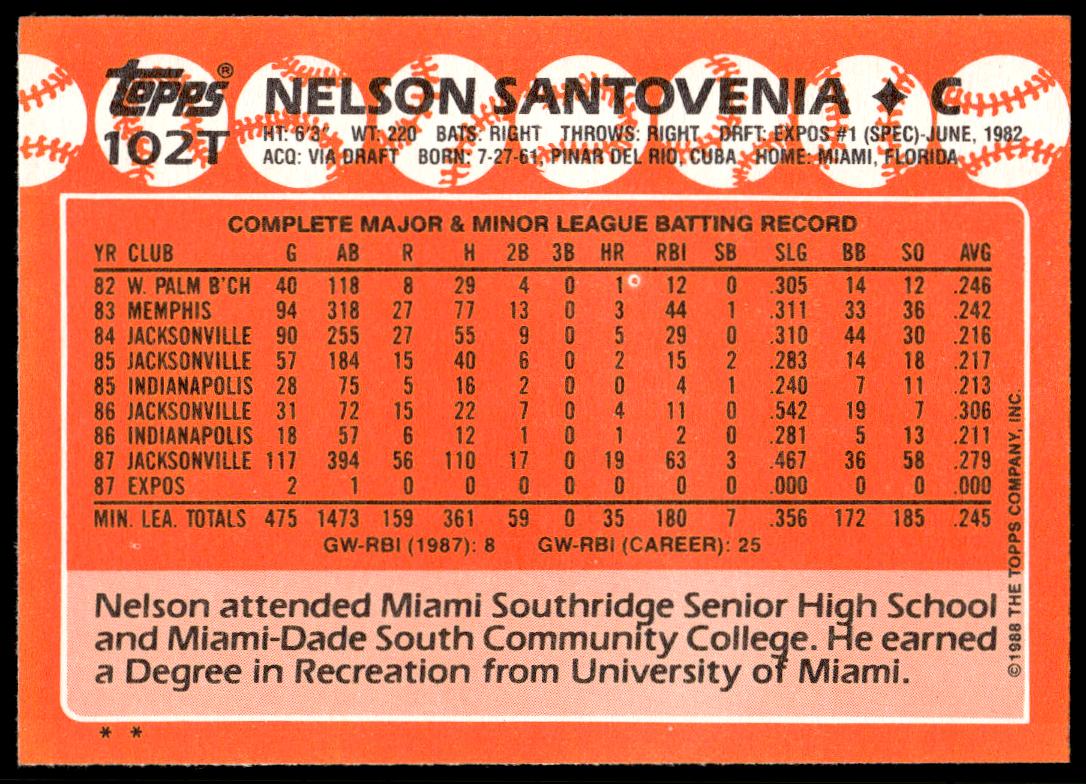 This BaseballΒ card, from 1988 is part of the Topps TradedΒ card set. Nelson Santovenia is featured and has a card number of 102T.