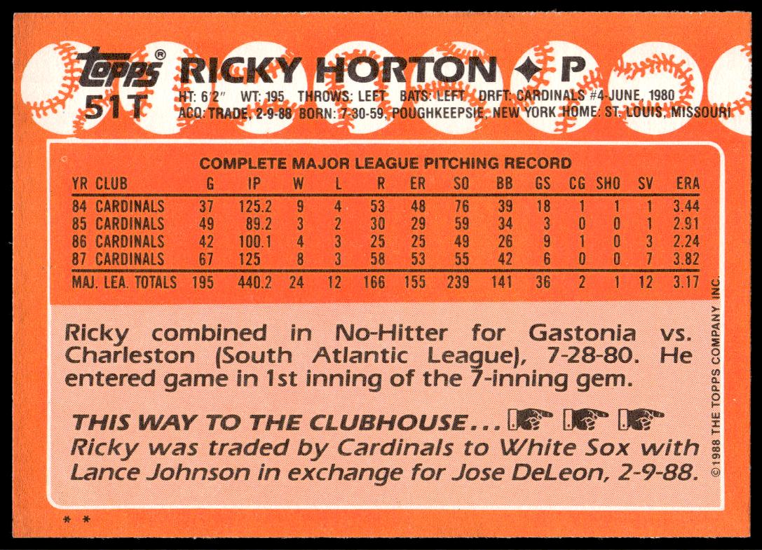 This BaseballΒ card, from 1988 is part of the Topps TradedΒ card set. Ricky Horton is featured and has a card number of 51T.
