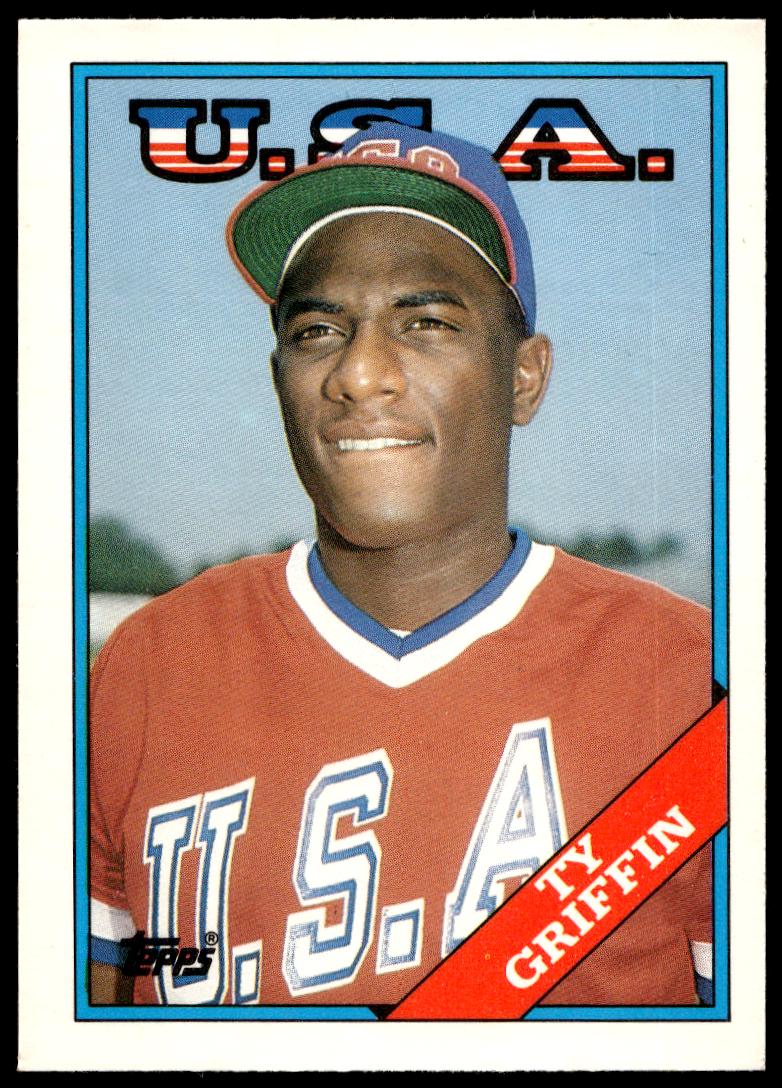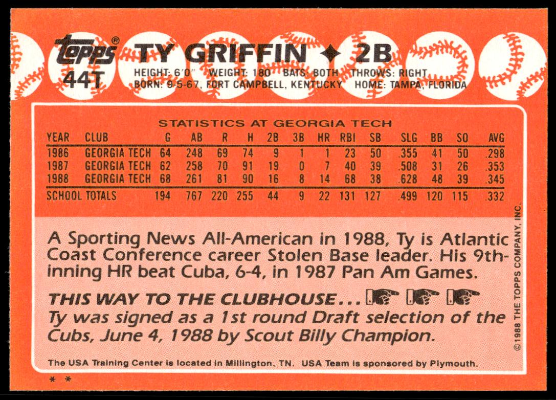 This Baseball card, from 1988 is part of the Topps Traded card set. Ty Griffin is featured and has a card number of 44T.