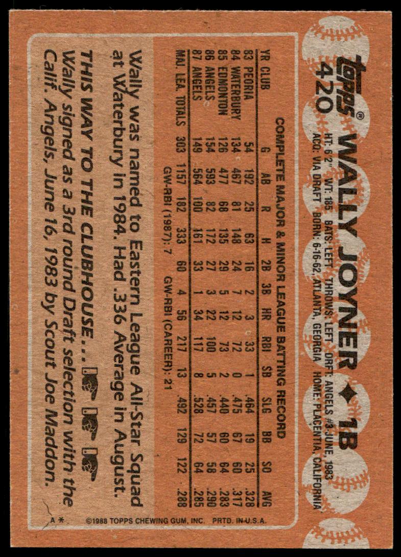 This Baseball card, from 1988 is part of the Topps  card set. Wally Joyner is featured and has a card number of 420.