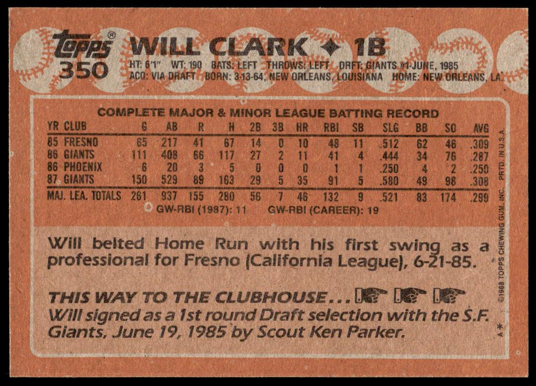 This Baseball card, from 1988 is part of the Topps  card set. Will Clark is featured and has a card number of 350.