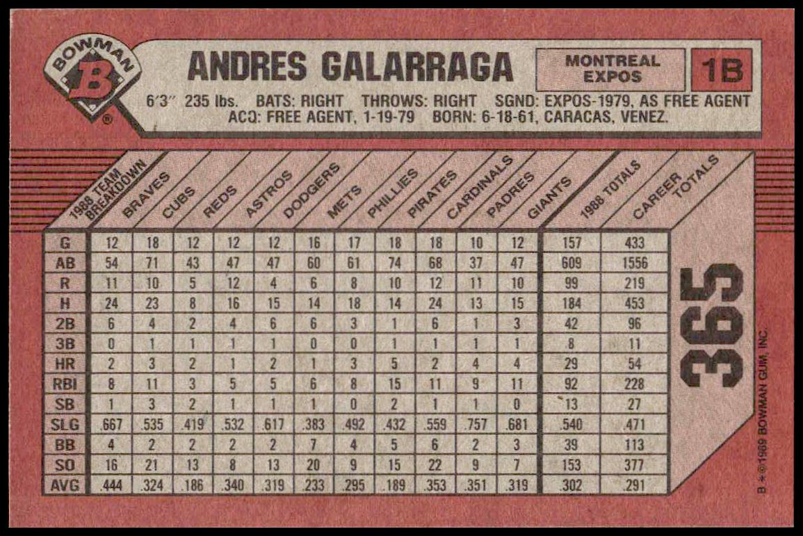 This Baseball card, from 1989 is part of the Bowman  card set. Andres Galarraga is featured and has a card number of 365.