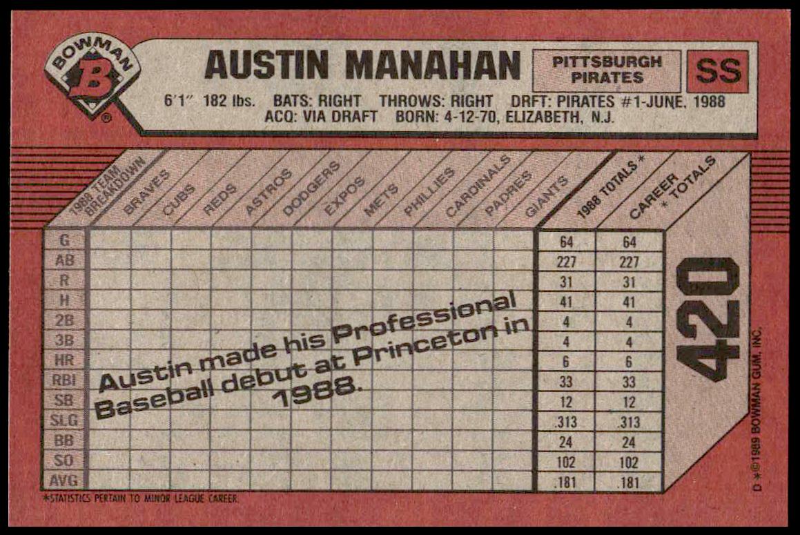 This Baseball card, from 1989 is part of the Bowman  card set. Austin Manahan is featured and has a card number of 420.