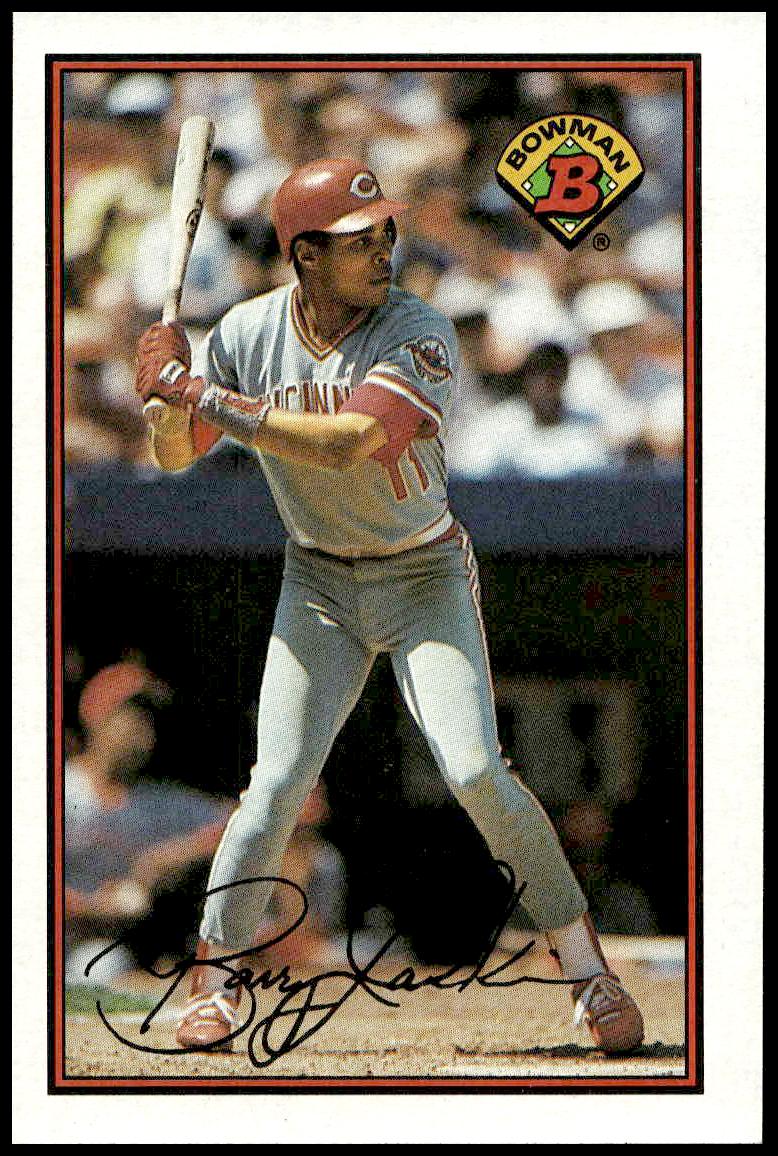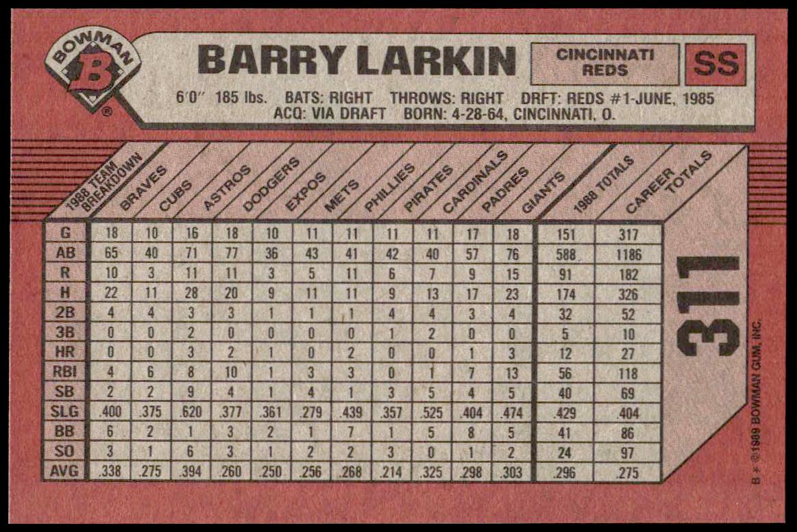 This Baseball card, from 1989 is part of the Bowman  card set. Barry Larkin is featured and has a card number of 311.