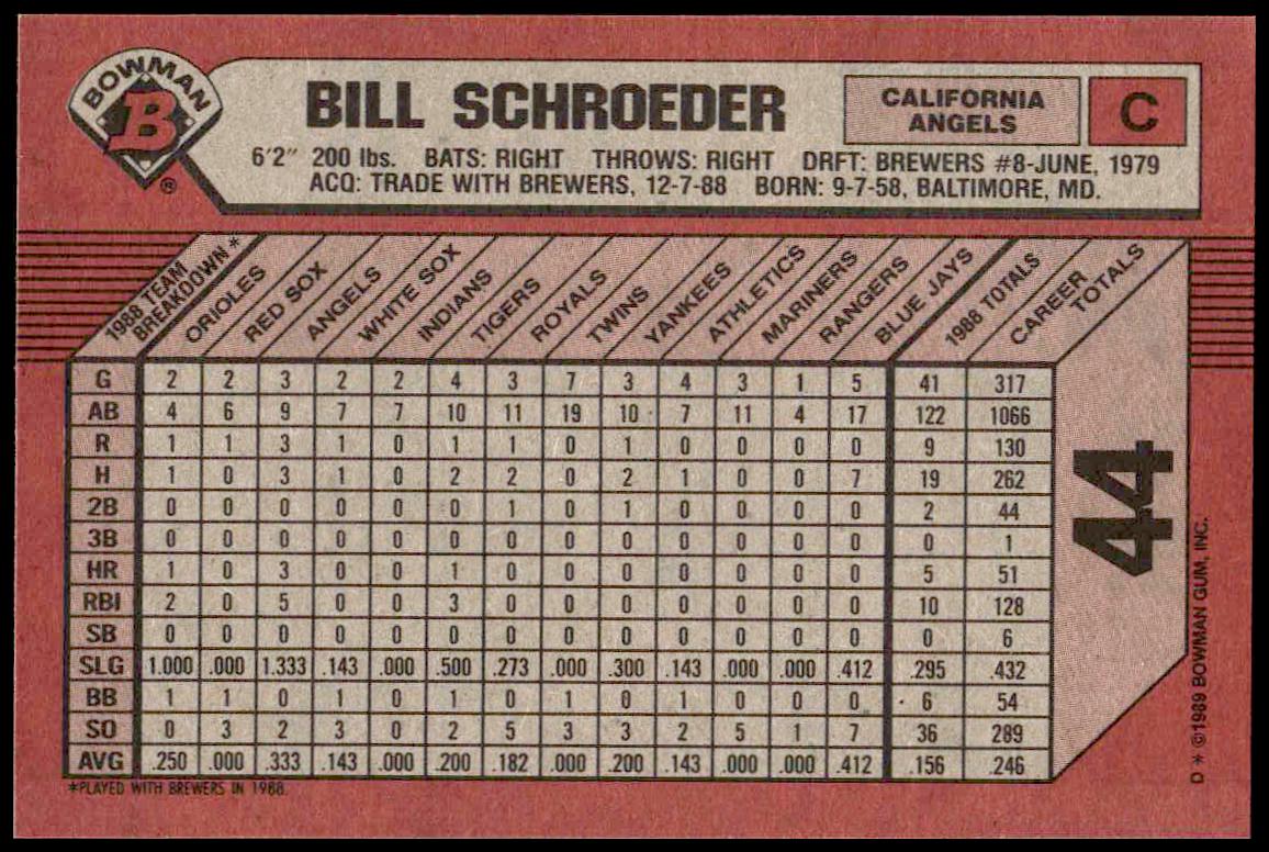 This Baseball card, from 1989 is part of the Bowman  card set. Bill Schroeder is featured and has a card number of 44.