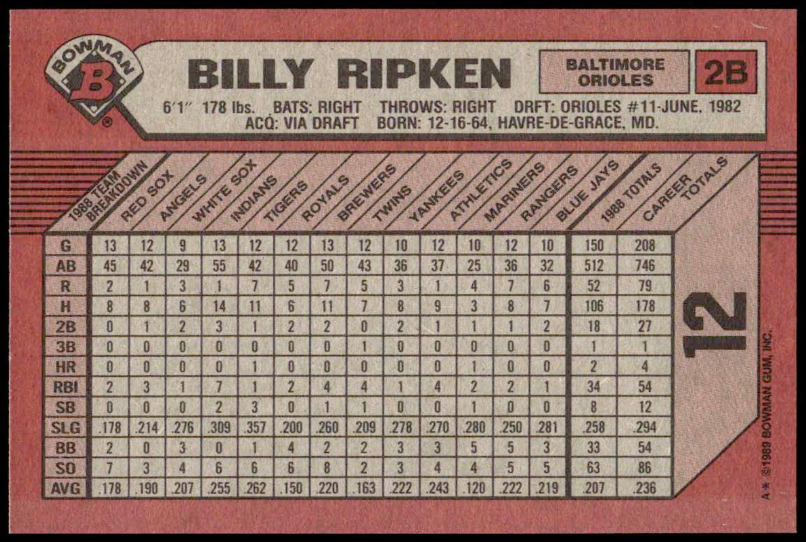 This Baseball card, from 1989 is part of the Bowman  card set. Billy Ripken is featured and has a card number of 12.