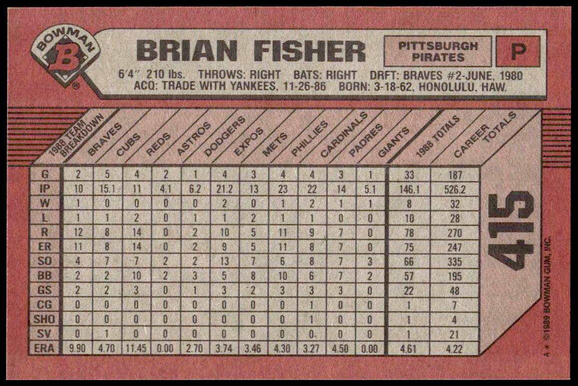 This Baseball card, from 1989 is part of the Bowman  card set. Brian Fisher is featured and has a card number of 415.