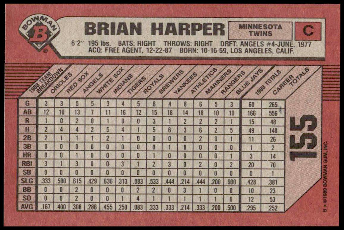 This Baseball card, from 1989 is part of the Bowman  card set. Brian Harper is featured and has a card number of 155.