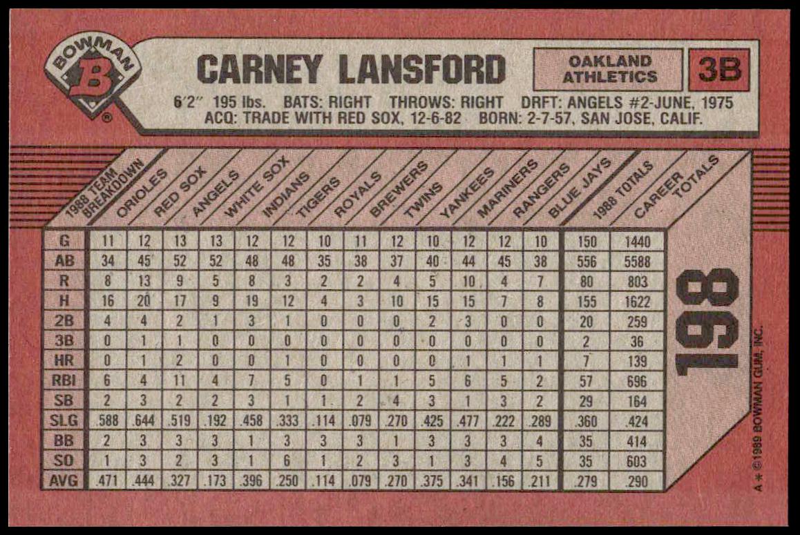 This Baseball card, from 1989 is part of the Bowman  card set. Carney Lansford is featured and has a card number of 198.