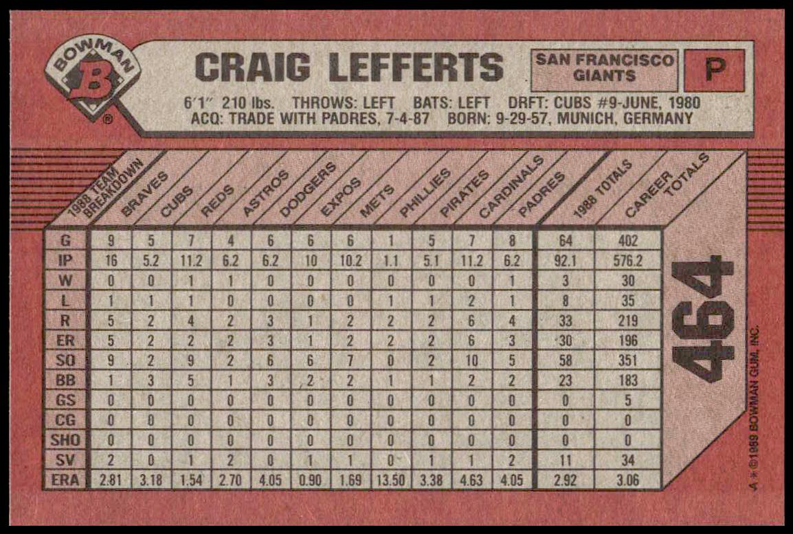 This Baseball card, from 1989 is part of the Bowman  card set. Craig Lefferts is featured and has a card number of 464.
