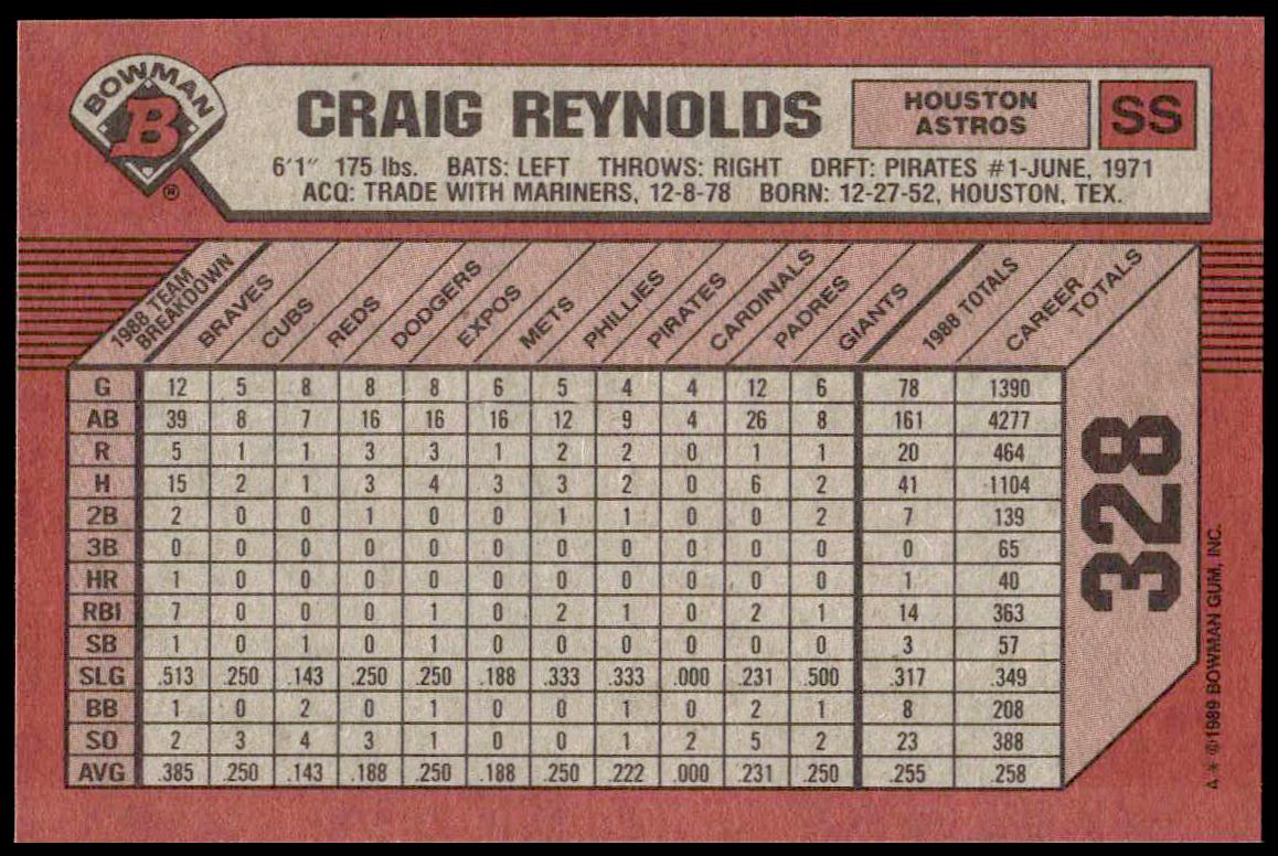 This Baseball card, from 1989 is part of the Bowman  card set. Craig Reynolds is featured and has a card number of 328.