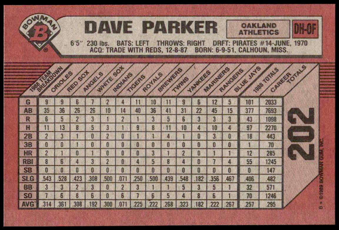 This Baseball card, from 1989 is part of the Bowman  card set. Dave Parker is featured and has a card number of 202.