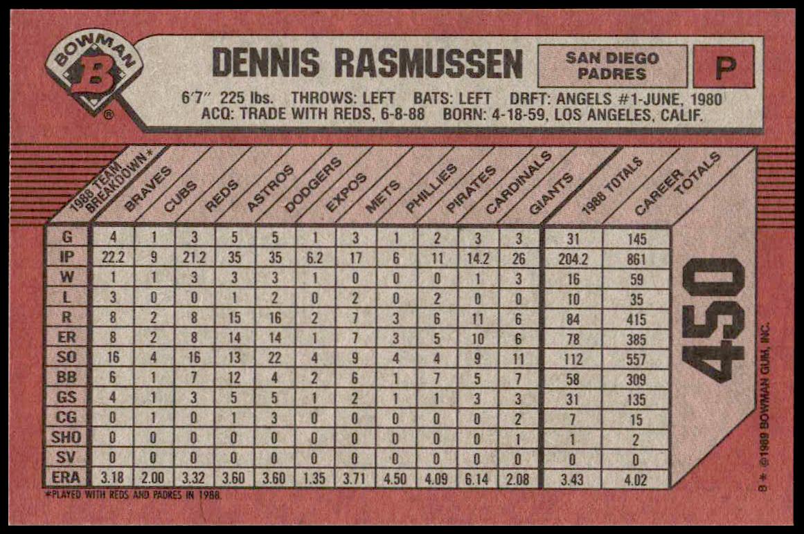 This Baseball card, from 1989 is part of the Bowman  card set. Dennis Rasmussen is featured and has a card number of 450.
