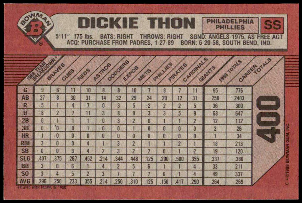 This Baseball card, from 1989 is part of the Bowman  card set. Dickie Thon is featured and has a card number of 400.