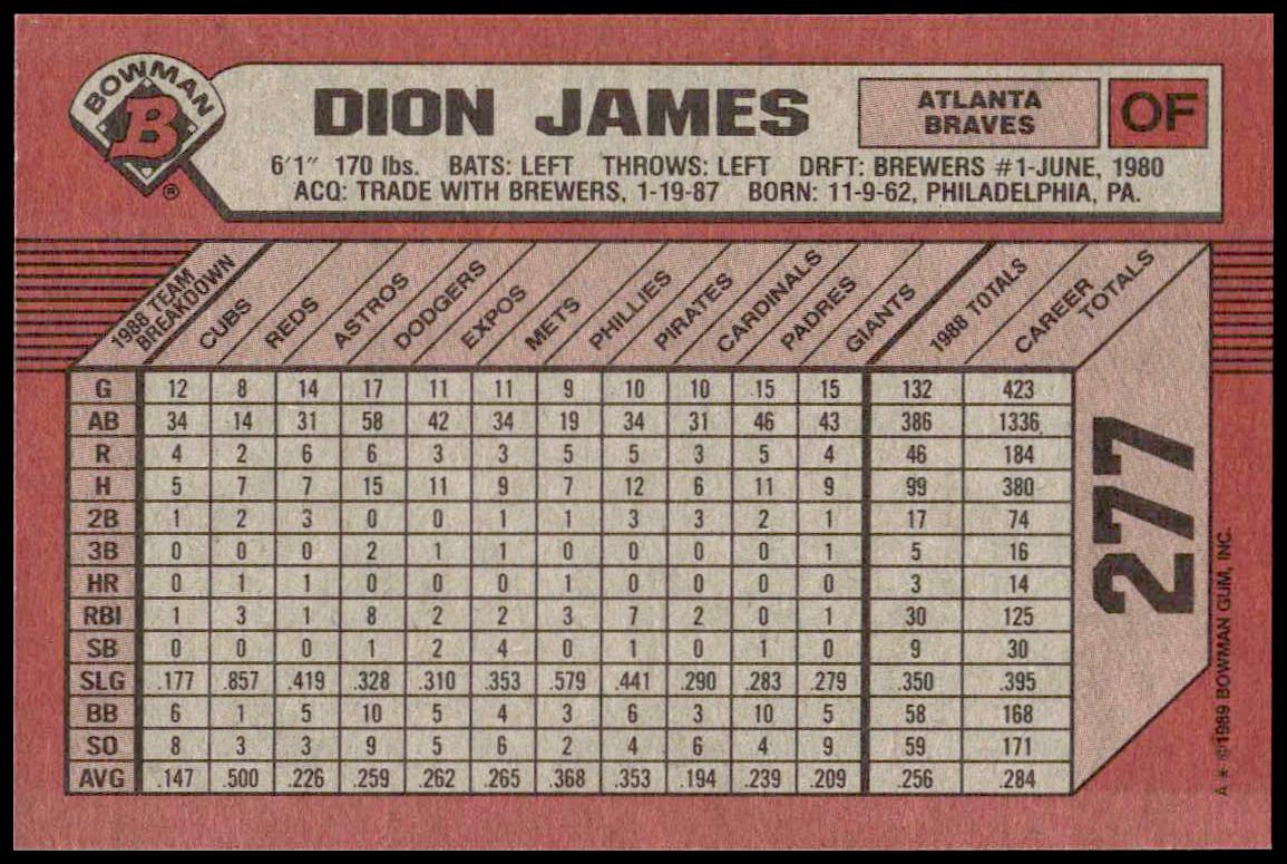 This Baseball card, from 1989 is part of the Bowman  card set. Dion James is featured and has a card number of 277.