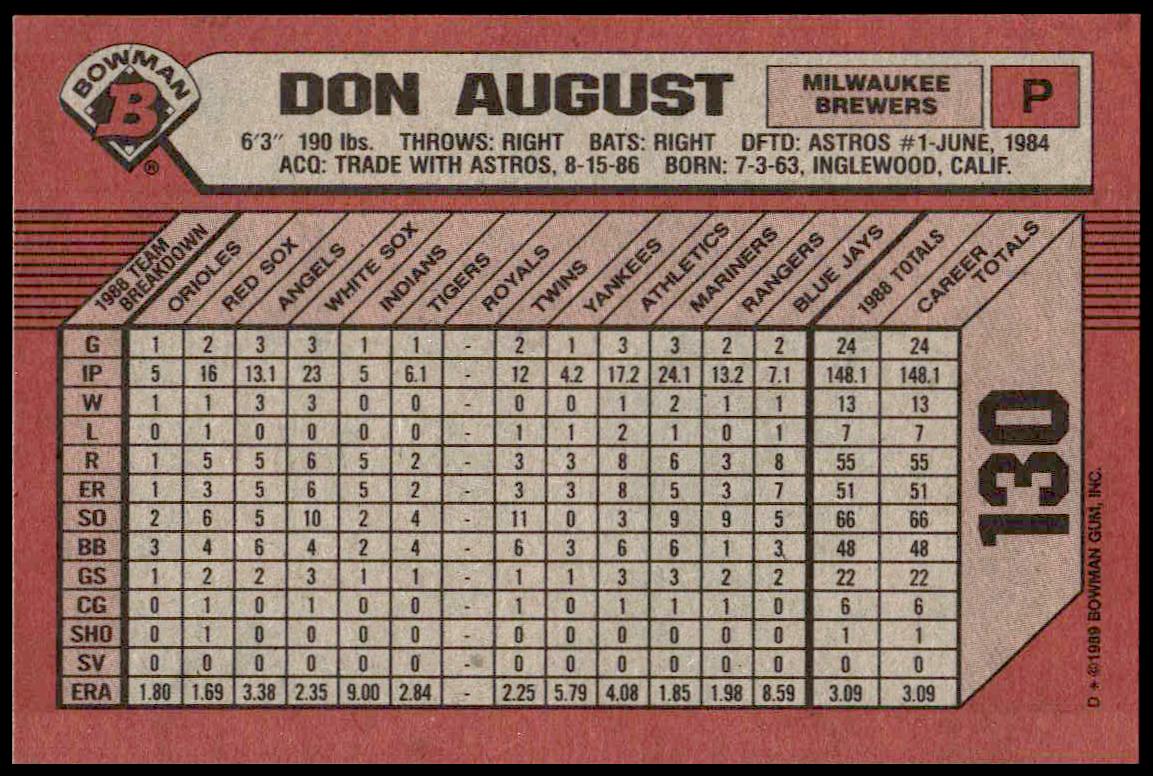 This Baseball card, from 1989 is part of the Bowman  card set. Don August is featured and has a card number of 130.