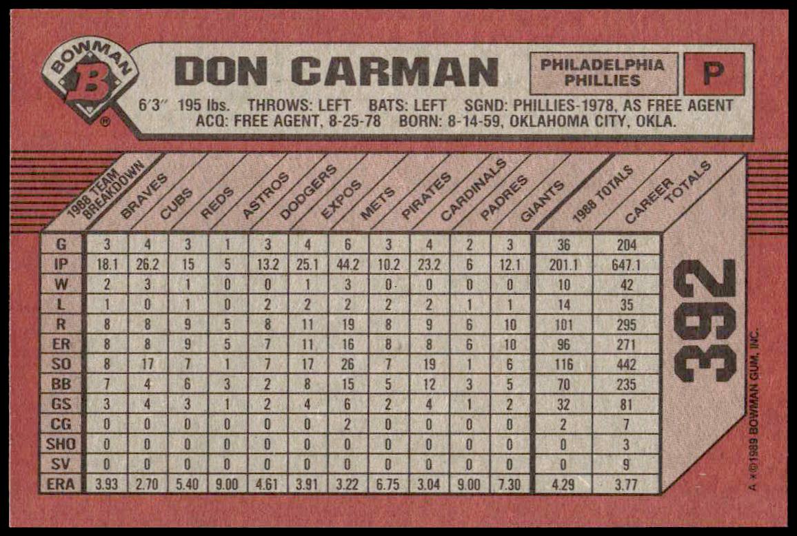 This Baseball card, from 1989 is part of the Bowman  card set. Don Carman is featured and has a card number of 392.