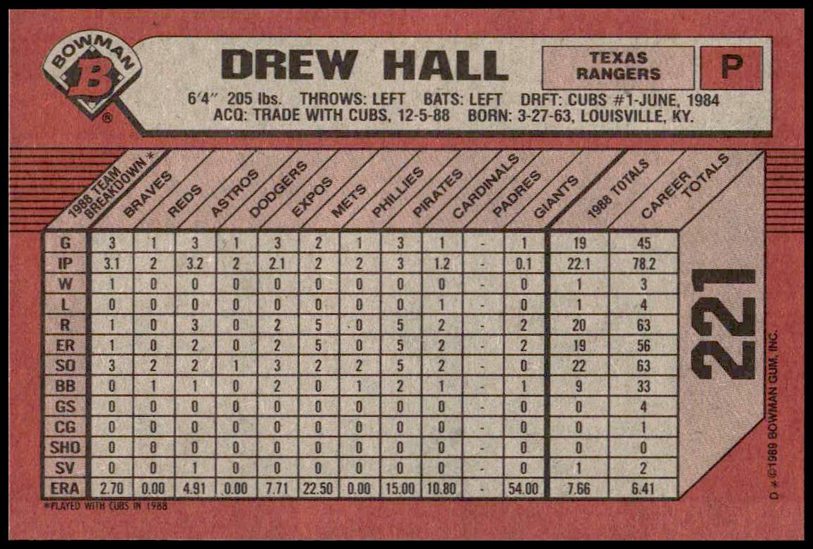 This Baseball card, from 1989 is part of the Bowman  card set. Drew Hall is featured and has a card number of 221.