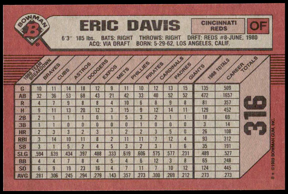 This Baseball card, from 1989 is part of the Bowman  card set. Eric Davis is featured and has a card number of 316.