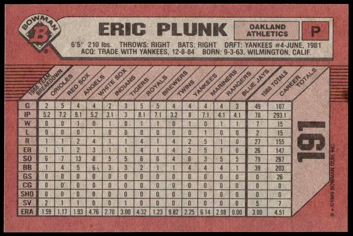 This Baseball card, from 1989 is part of the Bowman  card set. Eric Plunk is featured and has a card number of 191.