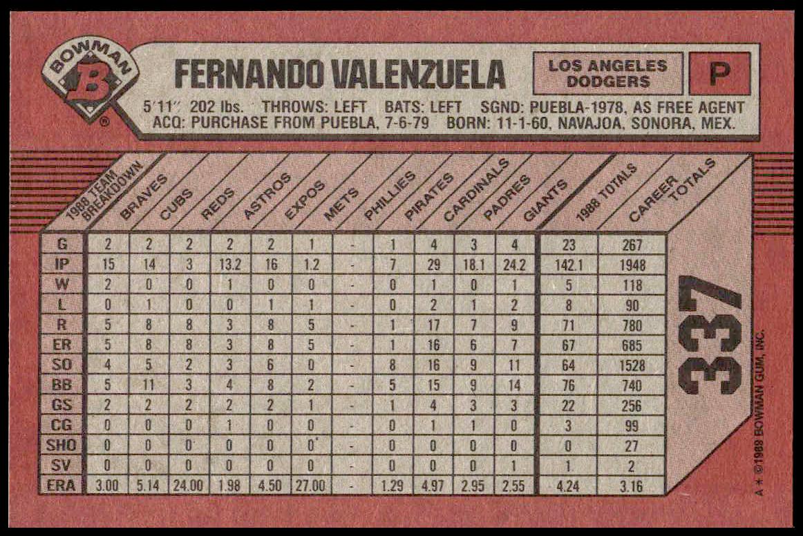 This BaseballΒ card, from 1989 is part of the Bowman Β card set. Fernando Valenzuela is featured and has a card number of 337.