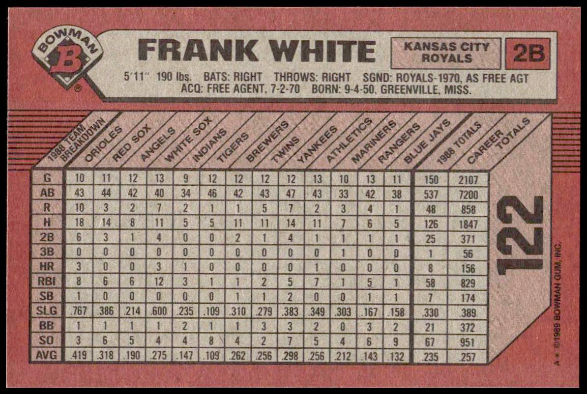 This Baseball card, from 1989 is part of the Bowman  card set. Frank White is featured and has a card number of 122.