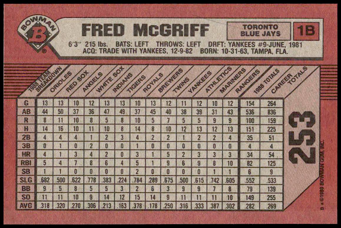 This Baseball card, from 1989 is part of the Bowman  card set. Fred McGriff is featured and has a card number of 253.