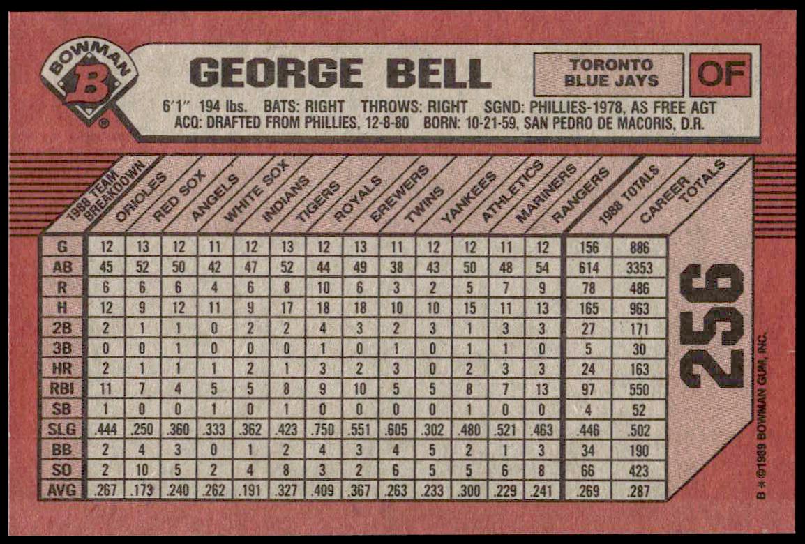 This Baseball card, from 1989 is part of the Bowman  card set. George Bell is featured and has a card number of 256.