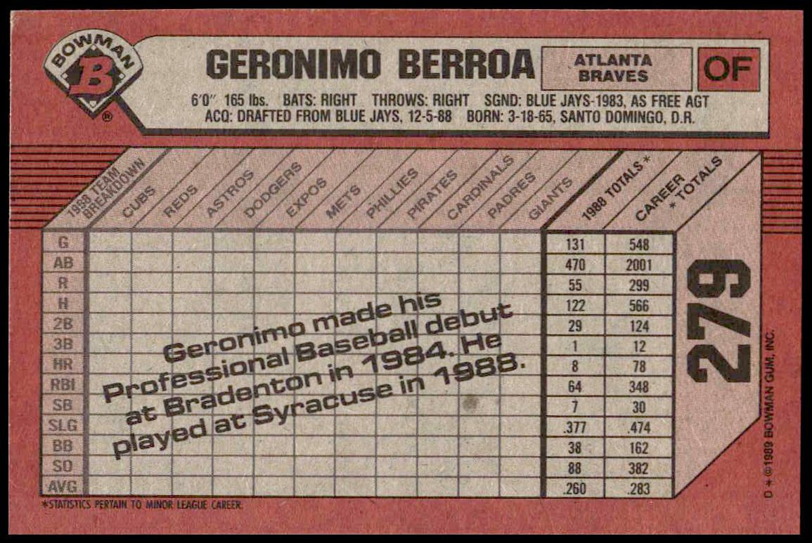 This Baseball card, from 1989 is part of the Bowman  card set. Geronimo Berroa is featured and has a card number of 279.
