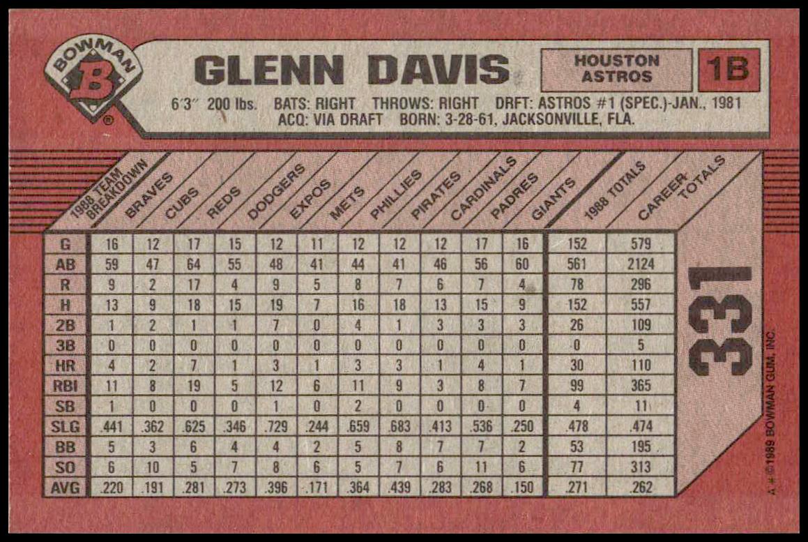 This Baseball card, from 1989 is part of the Bowman  card set. Glenn Davis is featured and has a card number of 331.