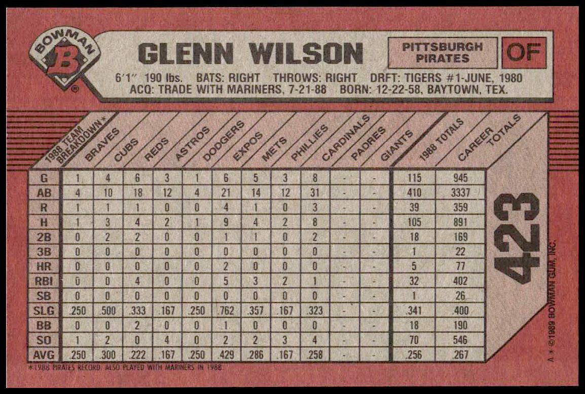 This Baseball card, from 1989 is part of the Bowman  card set. Glenn Wilson is featured and has a card number of 423.