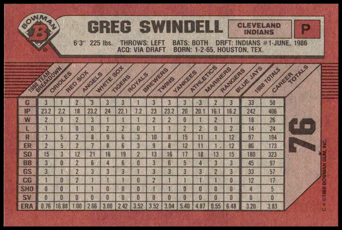 This Baseball card, from 1989 is part of the Bowman  card set. Greg Swindell is featured and has a card number of 76.