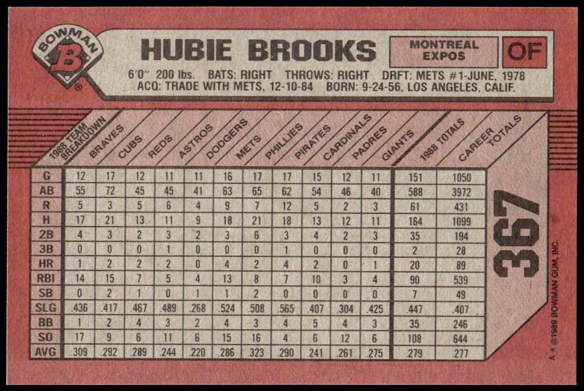 This Baseball card, from 1989 is part of the Bowman  card set. Hubie Brooks is featured and has a card number of 367.